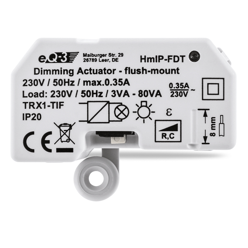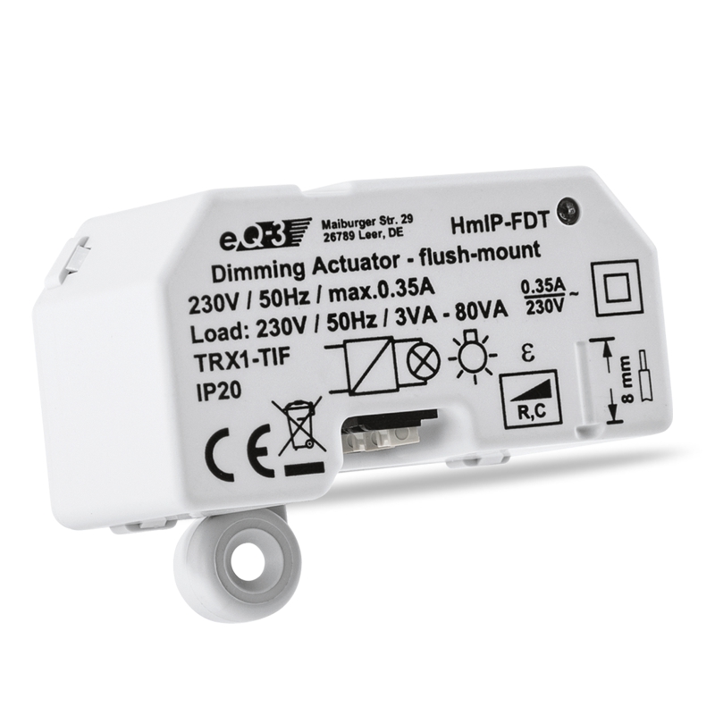 Stmievací akčný člen (HmIP-FDT) sa montuje do štandardnej zápustnej krabice pod omietku alebo do krabice pre povrchovú montáž s pripojením do siete 230 V. Bezdrôtová komunikácia ponúka možnosť inštalácie bez potreby druhotnej kabeláže. To znamená, že akčný člen je možné umiestniť v mieste pripraveného alebo existujúceho elektrického rozvodu siete 230 V.