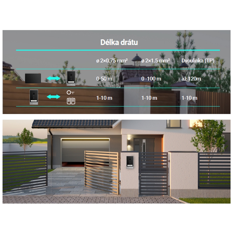 Otevření dveří (brány): Podpora 2 připojovacích portů. 1-10m vzdálenost. Interkomový panel poskytuje „suchý“ kontakt pro připojení k tlačítku automatické brány, spínací kapacita brány: 12V / 2A