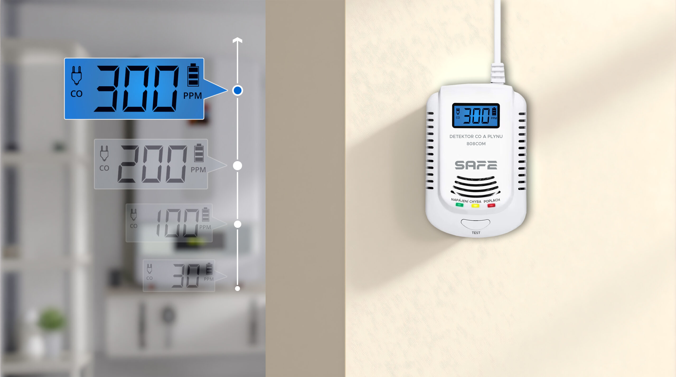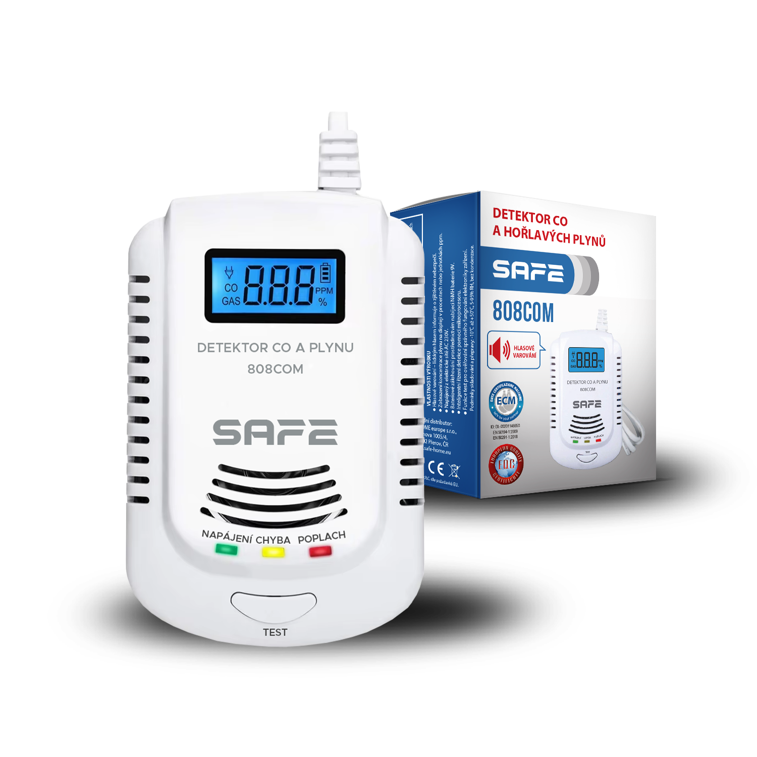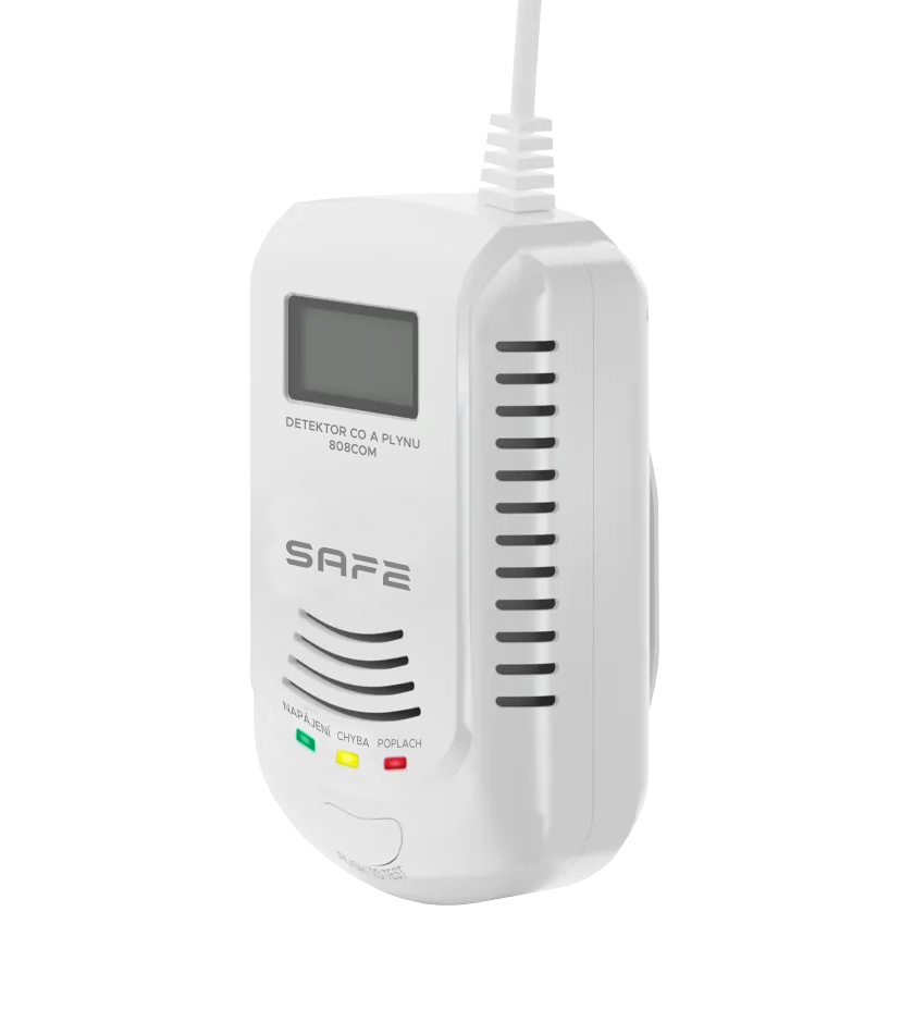 Kombinovaný detektor CO, horľavých a výbušných plynov SAFE-808COM s batériovým zálohovaním, digitálnym displejom, pamäťou posledného poplachu a unikátnou funkciou hlasového varovania v českom jazyku.
