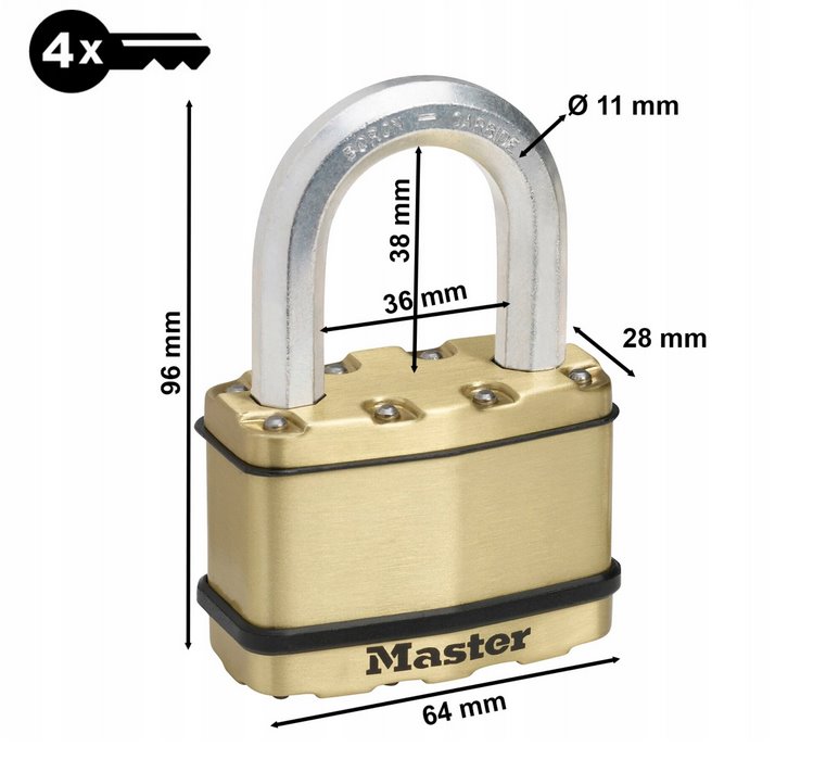 - Visiaci zámok so šírkou 64 mm s telom z vrstvenej ocele s mosadznou úpravou pre vyššiu odolnosť a spoľahlivosť.