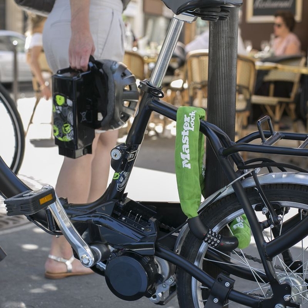 Spevnený oceľový reťaz s integrovaným kombinovaným zámkom je 90 cm dlhý a obsahuje oceľové spojky s priemerom 8 mm, ktoré odolávajú rezanie. Nylonový kryt reťaze zabraňuje poškrabaniu. Zámok obsahuje Resetovateľný kombináciu 4 číslic.